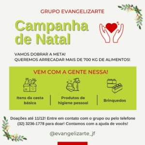 As doações serão recebidas até o dia 11 de dezembro. Para ajudar, basta entrar em contato com algum integrante do grupo, pelo Instagram do Evangelizarte ou pelo telefone/WhatsApp (32) 3236-1778.