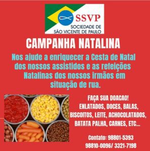 A Sociedade de São Vicente de Paulo (SSVP) também está em busca de doações para enriquecer a cesta de Natal das famílias assistidas e as refeições natalinas para aqueles que estão em situação de rua. Entre os artigos bem-vindos estão enlatados, doces, biscoitos, leite, achocolatado, batata palha e carnes.