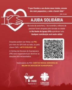 Nesse cenário de dor e urgência, a Cáritas Diocesana de Guarapuava, em articulação com o Regional Sul 2 da CNBB, lançou uma campanha de ajuda solidária para arrecadar recursos destinados às famílias atingidas. As doações podem ser feitas via PIX, pela chave CNPJ: 48791935/0001-60, ou pelo QR Code disponível na imagem abaixo. O destinatário pix é: CÁRITAS NOSSA SENHORA DE BELÉM DA DIOCESE DE GUARAPUAVA.