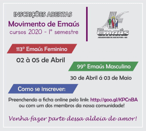 Já estão abertas as inscrições para os cursos do primeiro semestre do Movimento de Emaús. Enquanto a 113ª edição do Emaús Feminino será realizada entre os dias 2 e 5 de abril, o 99º curso masculino está previsto para 30 de abril a 3 de maio. Ambos acontecerão no Ceflã.