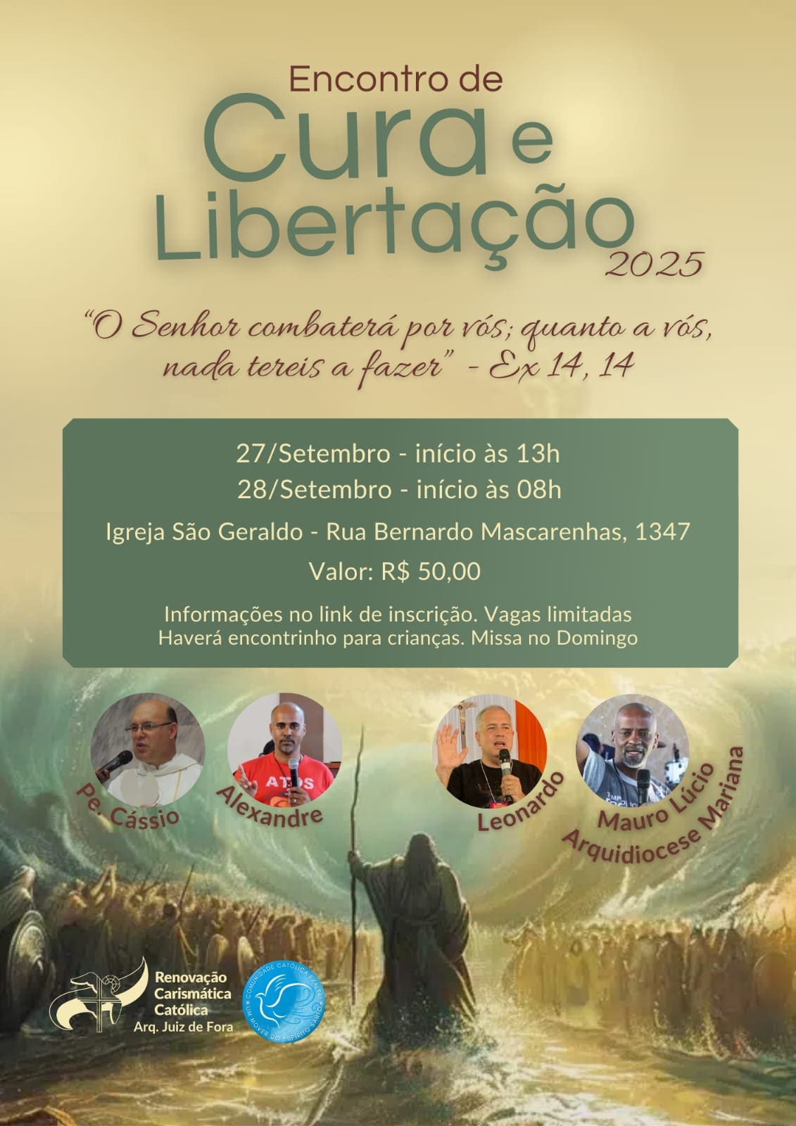 Nos dias 27 e 28 de setembro, a Renovação Carismática Católica (RCC), por meio do Ministério de Oração por Cura e Libertação (MOCL), realiza mais uma edição do Encontro de Cura e Libertação da Arquidiocese de Juiz de Fora. O evento, que acontecerá na Igreja São Geraldo, no bairro Fábrica, tem como tema a passagem bíblica de Êxodo 14,14: “O Senhor combaterá por vós; quanto a vós, nada tereis a fazer”.
