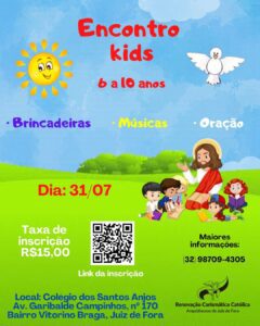 O Ministério para as Crianças da Renovação Carismática Católica (RCC) da Arquidiocese de Juiz de Fora já está recebendo inscrições para o Encontro Kids que promoverá no dia 31 de julho. O evento, voltado para crianças de 6 a 10 anos de idade, será realizado no Colégio dos Santos Anjos.