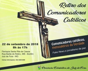 A Arquidiocese de Juiz de Fora sediará, pela terceira vez, o Retiro de Comunicadores Católicos da Província Eclesiástica de Juiz de Fora. O evento será realizado nas dependências da Paróquia Santa Rita de Cássia, localizada no Bairro Bonfim, em Juiz de Fora, no dia 22 de setembro (sábado), entre 8h e 17h.