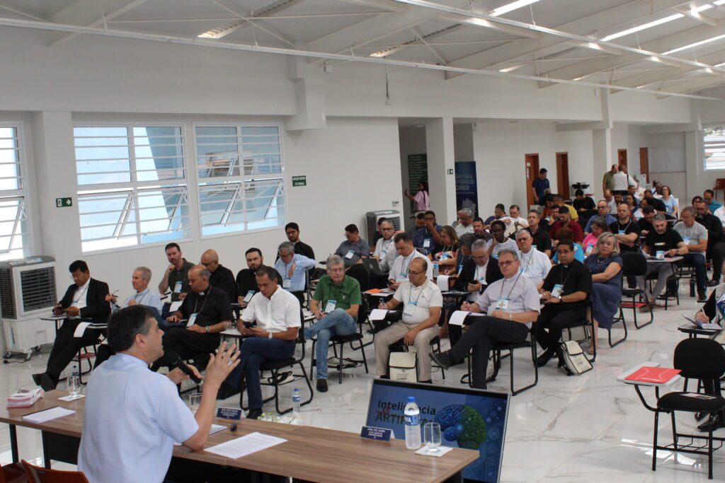 O tema “Inteligência Artificial” pautou o último dia de reflexões, partilha e comunhão da Assembleia Ampliada do Conselho Episcopal do Regional Leste 2 (CONSER), nesta quinta-feira, 28 de novembro, no Instituto de Integração Pessoal – Casa Mãe Acolhedora – ADI, em Belo Horizonte. A Santa Missa presidida por Dom Gil Antônio Moreira, Arcebispo da Arquidiocese de Juiz de Fora, e concelebrada por Dom José Carlos de Souza Campos, Arcebispo da Arquidiocese de Montes Claros e Presidente do Regional Leste 2, Dom Airton José dos Santos, Arcebispo da Arquidiocese de Mariana e Vice-presidente do Regional Leste 2, Dom Joel Maria dos Santos, Bispo Auxiliar da Arquidiocese de Belo Horizonte e Secretário do Regional Leste 2, deu início às atividades.