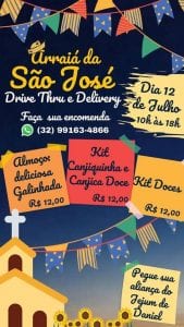 Também neste domingo acontece o Arraiá de São José. Os serviços de delivery e drive-thur dos quitutes que estariam em barraquinhas, serão a alternativa adotada por conta do isolamento social. A festividade funcionará das 10h às 18h. O telefone para encomendas é (32) 99163-4866.