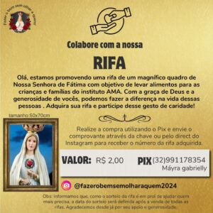 O tempo da quaresma rendeu um projeto de caridade para nove jovens católicos. O grupo chamado “Fazer o bem sem olhar a quem” foi criado com o objetivo de praticar a caridade com aqueles que mais precisam. Seu primeiro projeto é ajudar o Instituto Amigos Mãos Abertas (AMA) com recursos. Em vista disso, eles estão realizando a rifa de um quadro de Nossa Senhora de Fátima.