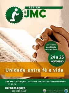 Os integrantes da Comunidade dos Jovens Missionários Continentais (JMC) participarão, neste sábado (24) e domingo (25), de um retiro espiritual. Durante os dias de encontro, os jovens assistirão a palestras, participarão de missa e de momentos de deserto e partilha em grupo.