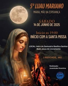 No próximo sábado, 14 de junho, os jovens da Sociedade de São Vicente de Paulo (SSVP) convidam toda a comunidade para uma noite especial de fé, amizade e devoção mariana. O 5º Luau Mariano, que este ano traz como tema “Maria, Mãe da Esperança”, será realizado às 19h, no adro da Basílica Bom Jesus do Livramento, em Liberdade (MG).