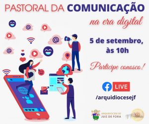 Neste sábado, 5 de setembro, será promovida a live ‘Pastoral da Comunicação na era digital’, às 10h, no Facebook da Arquidiocese de Juiz de Fora. Momento de diálogo a respeito do trabalho da pastoral que ganhou ainda mais destaque neste tempo de pandemia.