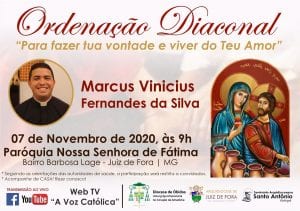 O seminarista Marcus Vinicius Fernandes da Silva será ordenado Diácono Transitório no próximo sábado, 7 de novembro, às 9h, durante Celebração Eucarística na Matriz Nossa Senhora de Fátima, no Bairro Barbosa Lage. A Missa será presidida pelo Bispo da Diocese de Óbidos (PA) – Igreja Particular de origem do jovem -, Dom Bernardo Johannes Bahlmann, OFM, e concelebrada pelo Arcebispo Metropolitano de Juiz de Fora, Dom Gil Antônio Moreira.