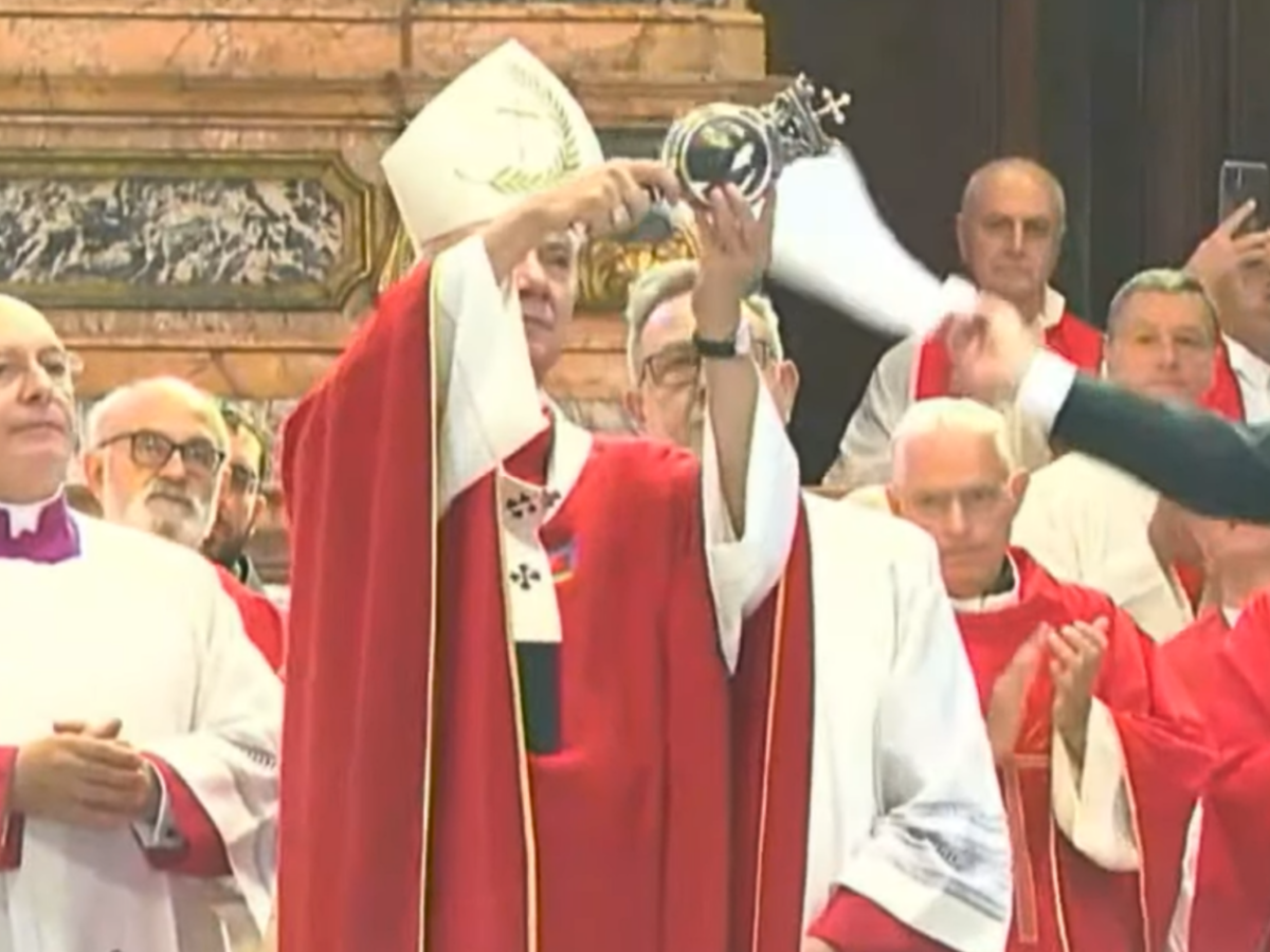 No início da celebração da Missa na Catedral, o Arcebispo Dom Domenico Battaglia, apresentou aos fiéis a âmbula com o sangue do santo que se liquefez às 10h08 (hora local).
