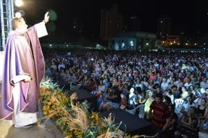 Em seguida, teve início a Eucaristia, que este ano teve o tema inspirado em trecho do evangelho de São Mateus (17,20): “Jesus respondeu-lhes: ‘Por causa de vossa falta de fé. Em verdade vos digo: se tiverdes fé, como um grão de mostarda, direis a esta montanha: Transporta-te daqui para lá, e ela irá; e nada vos será impossível’.”