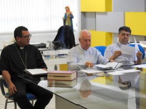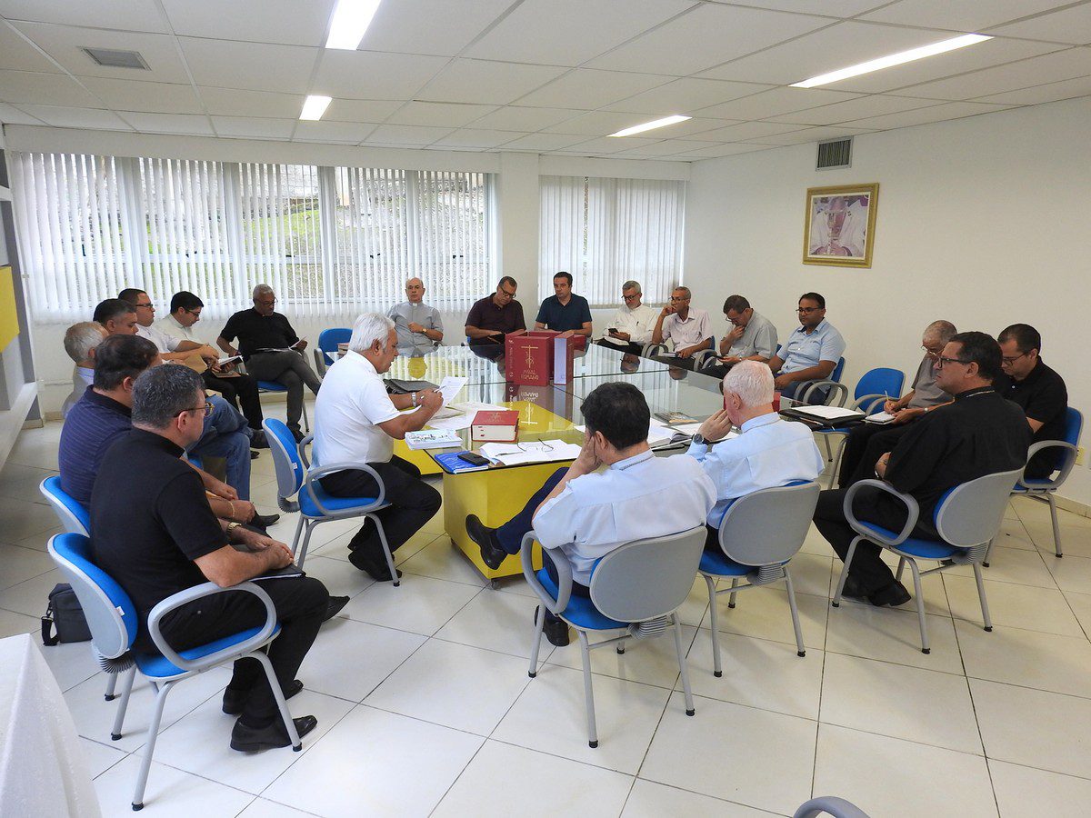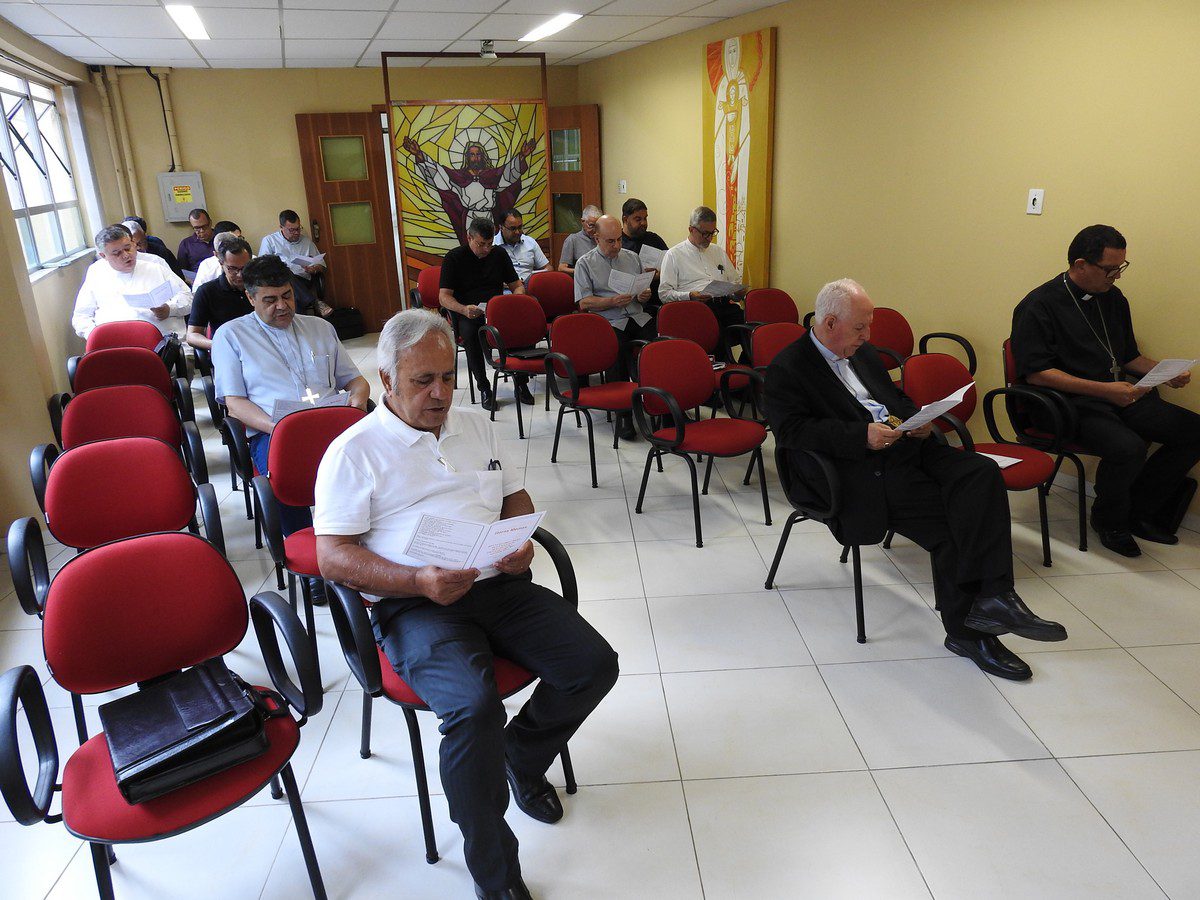 Junto aos prelados, estiveram os padres que os auxiliam de forma mais próxima, sobretudo os coordenadores de pastoral, os vigários episcopais, os representantes dos presbíteros, os vigários gerais e os reitores de seminários. “Quatro vezes por ano nós nos reunimos, os três bispos com os padres colaboradores mais próximos, para poder, primeiramente, partilhar um pouco daquilo que está acontecendo em cada diocese; depois, sempre temos um tema de estudo”, explicou Dom Gil. Desta vez, o assunto abordado foi a 3ª edição típica do Missal Romano, que começa a ser utilizado obrigatoriamente no dia 3 de dezembro. A palestra foi ministrada pelo Padre Leonardo Pinheiro, que era Assessor da Comissão de Liturgia da Conferência Nacional dos Bispos do Brasil (CNBB) à época da reformulação.