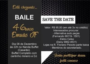 No dia 8 de dezembro, será a vez do baile em comemoração às mais de quatro décadas do Emaús na cidade, a partir das 22h, na Nana Buffet, antigo Casarão. A festa reunirá pessoas de todas as idades. Haverá buffet completo e DJ. Os convites podem ser adquiridos com os membros do secretariado do movimento por R$ 95, com a opção de dividir esse valor em três vezes.