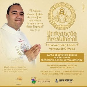 Na próxima segunda-feira, 7 de setembro, Dia da Independência do Brasil, o Diácono Transitório João Carlos Ventura de Oliveira será ordenado presbítero. A cerimônia, presidida pelo Arcebispo Metropolitano de Juiz de Fora, Dom Gil Antônio Moreira, será realizada em Bicas (MG), cidade-natal do ordenando. Naquele dia, além de celebrar a consagração definitiva de um filho seu, o município de cerca de 15 mil habitantes comemorará o aniversário de sua elevação.