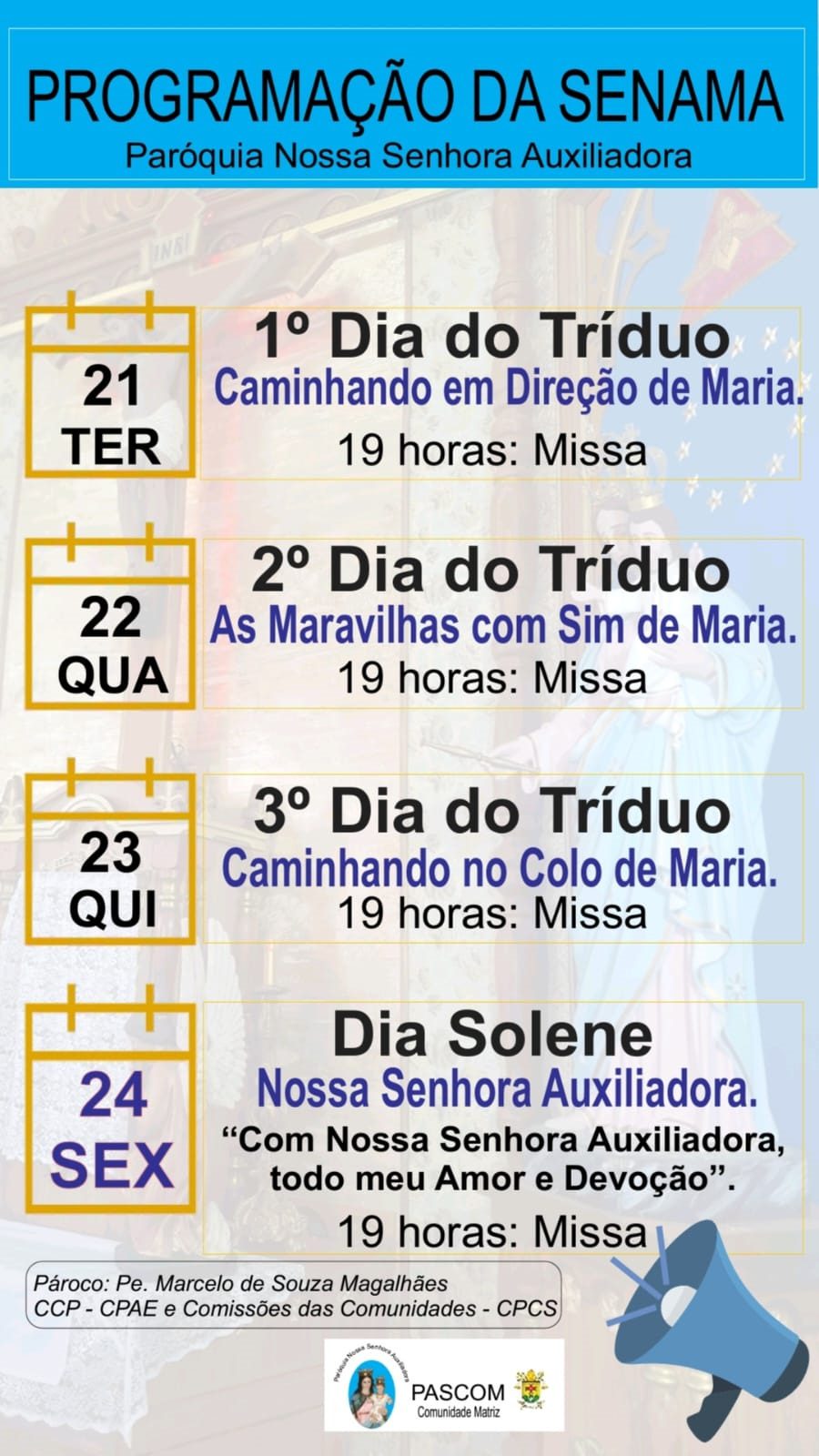 Na sexta-feira, 24 de maio, quando a Igreja celebra este título mariano que remonta ao tempo medieval da Igreja, a paróquia festejará Nossa Senhora Auxiliadora com Celebração Eucarística, também às 19h. A Matriz fica na Rua Onofre Mendes, 320 – Mundo Novo.