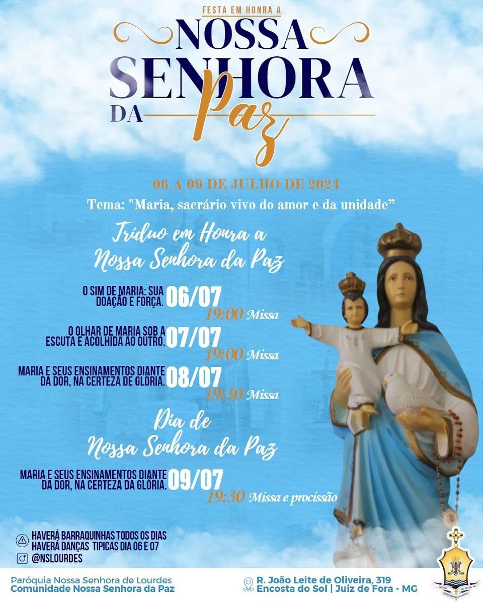 Neste sábado (6), às 19h, a Comunidade Nossa Senhora da Paz, localizada no Bairro Encosta do Sol, em Juiz de Fora, dá início ao tríduo em honra à sua padroeira, celebrada em 9 de julho. Neste ano, o tema que regerá as atividades será “Maria, sacrário vivo do amor e da unidade”.