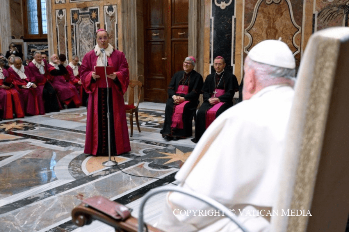 “Queridas irmãs, queridos irmãos, a Igreja lhes confia uma tarefa de grande responsabilidade, mas antes ainda de grande beleza: ajudar a purificar e restaurar as relações interpessoais. O contexto jubilar em que nos encontramos enche de esperança este trabalho, de esperança que não decepciona. Invoco sobre todos vocês, peregrinos de esperança, a graça de uma alegre conversão e a luz para acompanhar os fiéis rumo a Cristo, que é o juiz manso e misericordioso.”