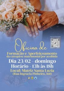 No próximo dia 23 de fevereiro, domingo, será realizada a Oficina de Formação e Aperfeiçoamento da Catequese Matrimonial por Acolhida. O encontro acontecerá das 13h às 18h, na Matriz Santa Luzia, no bairro homônimo.