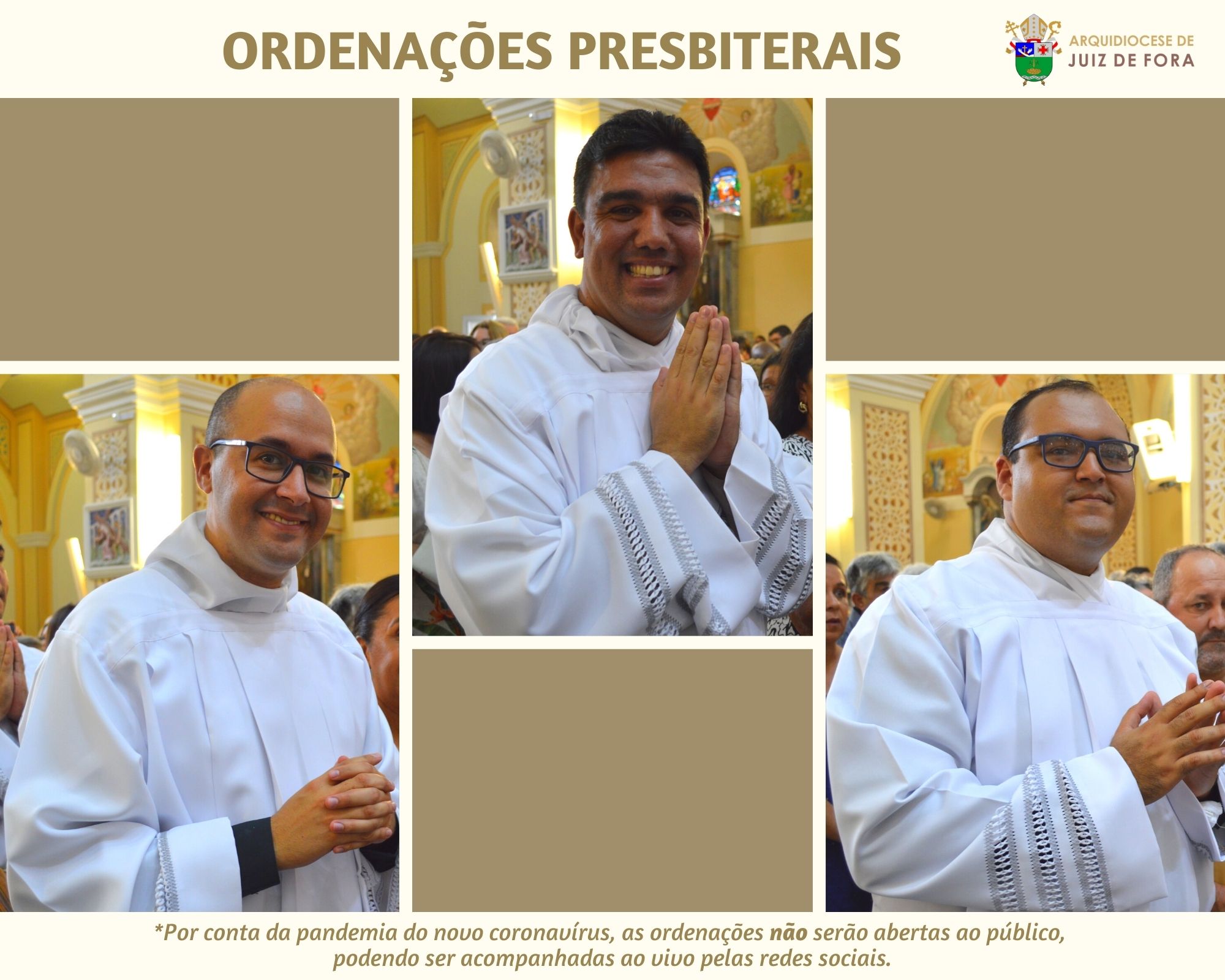 Em março deste ano, foram marcadas as datas das ordenações presbiterais dos diáconos transitórios João Carlos Ventura de Oliveira, Kayo Cerqueira de Paiva e Leandro de Senna Monaia, no entanto, devido a pandemia do novo coronavírus, elas precisaram ser adiadas.