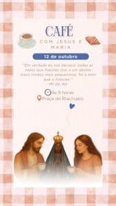 No dia 12 de outubro, quando a Igreja celebra a Solenidade de Nossa Senhora Aparecida, o Movimento realizará a missão “Café com Jesus e Maria”, a partir das 9h, na Praça do Riachuelo.