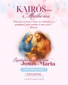 Já no dia 26 de outubro, o grupo promoverá o Kairós, voltado para mulheres, com o tema “Lapidadas no secreto com Jesus e Maria”. O evento acontecerá às 13h30, na Igreja Santa Ana – que fica na Rua Hermam Tolêdo, 85 – São Pedro.