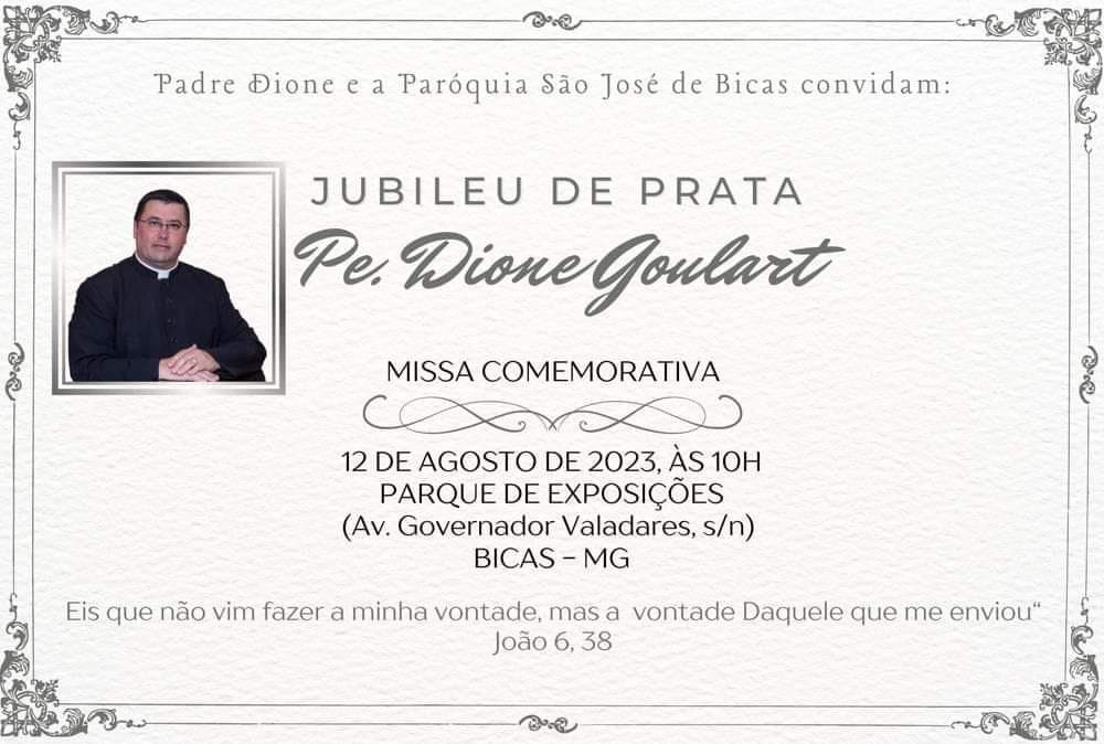 Esta Celebração encerrará o tríduo celebrativo que Padre Dione preparou para recordar seu Jubileu de Prata. Em junho, ele esteve na Paróquia São João Batista, de Jaciguá (ES), enquanto no mês seguinte visitou a sua cidade natal, Silveirânia (MG). A Missa será transmitida ao vivo pelo Facebook da paróquia de Bicas.