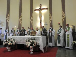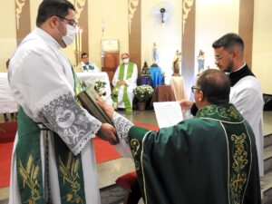 Em seguida, o novo Pároco, Padre Ivair, fez a Profissão de Fé, a Renovação das Promessas Sacerdotais e o Juramento de Fidelidade. Dando prosseguimento à cerimônia, ele recebeu das mãos de Padre Camilo as chaves da igreja e do sacrário, os Santos Óleos e a estola roxa. “O padre é aquele que garante os sacramentos na comunidade junto com o povo, numa experiência sinodal, e junto com os irmãos padres faz com que o Reino de Deus, a Igreja de Cristo, aconteça naquela paróquia”, ressaltou o Vigário Episcopal em entrevista.