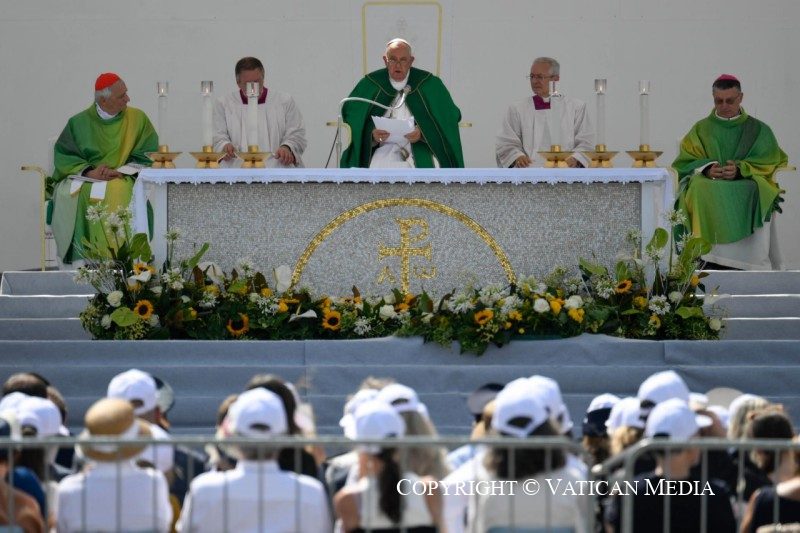 Desta cidade de Trieste, com vista para a Europa, encruzilhada de povos e culturas, terra de fronteira, alimentemos o sonho de uma nova civilização fundada na paz e na fraternidade; não nos escandalizemos com Jesus, mas, pelo contrário, indignemo-nos com todas aquelas situações em que a vida é brutalizada, ferida e morta; levemos a profecia do Evangelho em nossa carne, com as nossas escolhas antes mesmo das palavras. Com a coerência entre escolhas e palavras.
