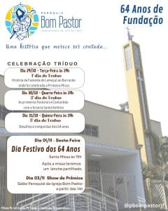 Em novembro, dia 1º, a Paróquia Bom Pastor, do bairro homônimo, completará seus 64 anos de fundação. Com o tema “Uma história que merece ser contada”, acontecerá um tríduo entre os dias 29 e 31 de outubro, às 19h.