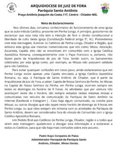 Na última quinta-feira (7), a Paróquia Santo Antônio, da cidade de Chiador (MG), divulgou em suas redes sociais uma nota de esclarecimento a respeito de uma suposta nova igreja católica em seu território.