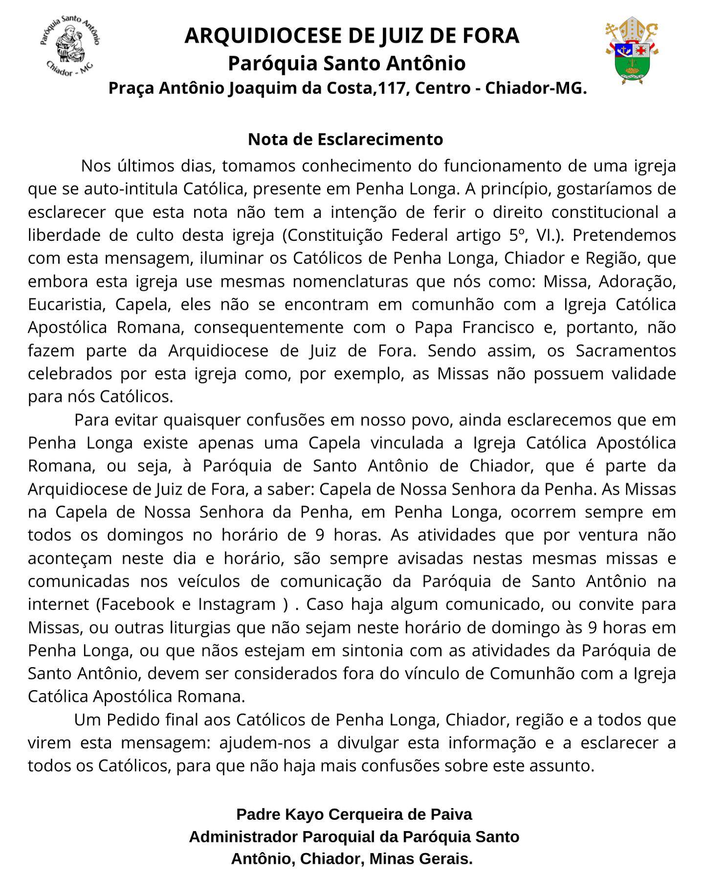 O documento, assinado pelo administrador da paróquia, Pe. Kayo Cerqueira de Paiva, visa explicitar que a Capela Nossa Senhora da Penha é a única comunidade ligada à Igreja Católica Apostólica Romana, situada em Penha Longa.
