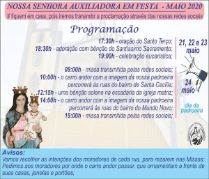 Durante a festa, haverá transmissões todos os dias, através das redes sociais da paróquia. Nos dias do tríduo, entre 21 e 23 de maio, haverá oração do Terço, às 17h30, Adoração e Benção do Santíssimo Sacramento, às 18h30, e Celebração Eucarística às 19h.