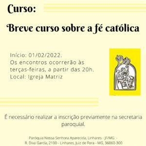 A Paróquia Nossa Senhora Aparecida do Bairro Linhares inicia, no dia 1º de fevereiro, um curso breve sobre a fé católica. A formação, que acontecerá sempre às terças-feiras, a partir das 20h, na Igreja Matriz, durará cerca de cinco meses e será gratuito.