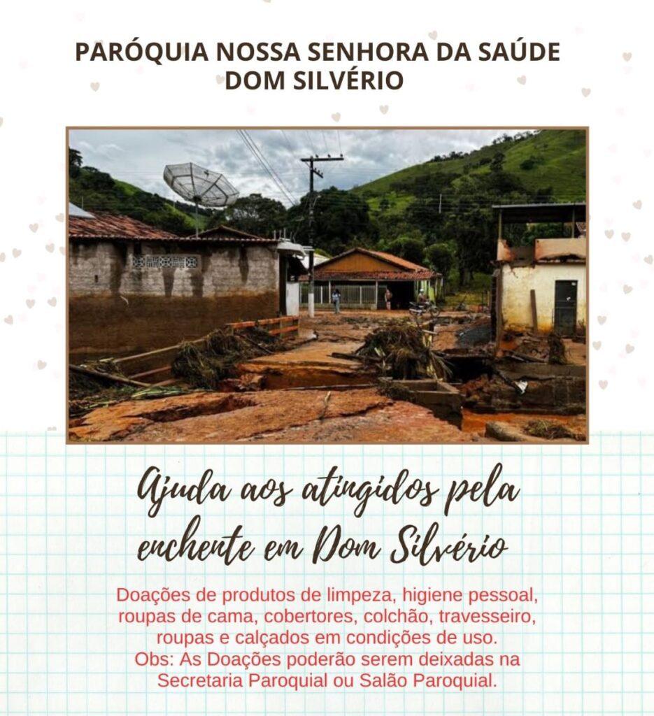 A fim de colaborar com as famílias atingidas, a Paróquia Nossa Senhora da Saúde, da cidade em questão, disponibilizou suas estruturas (secretaria ou salão paroquial) para ser ponto de referência e apoio em doações. As doações a serem feitas podem ser de: produtos de limpeza, higiene pessoal, roupas de cama, cobertores, colchão, travesseiro, roupas e calçados em condições de uso.