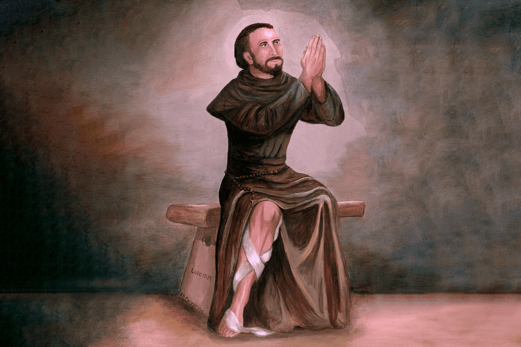 A história de São Peregrino remonta à Idade Média, na cidade de Forli, na Itália. O santo, que era monge da Ordem dos Servos de Maria, foi diagnosticado com uma ferida maligna na perna, cuja única solução médica seria a amputação. Na noite anterior à cirurgia, ele se arrastou até uma pequena capela dentro do mosteiro, onde, diante de um afresco de Cristo Crucificado, entregou sua dor em oração. Em meio ao sofrimento, desmaiou e, então, teve uma visão em que Jesus descia da cruz e tocava sua perna enferma. Ao despertar, a ferida havia desaparecido, surpreendendo a equipe médica e dando início à sua fama como intercessor dos enfermos.