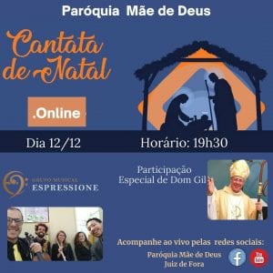 No próximo sábado, 12 de dezembro, a Paróquia Nossa Senhora Mãe de Deus, localizada no Bairro de Lourdes, em Juiz de Fora, promoverá uma Cantata de Natal on-line. O evento, marcado para as 19h30 e que será transmitido ao vivo pelo Facebook e YouTube, contará com a participação do Grupo Musical Espressione e do Arcebispo Metropolitano de Juiz de Fora, Dom Gil Antônio Moreira.