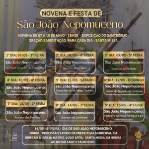 No dia 16, quando a Igreja celebra a festa litúrgica do primeiro mártir do segredo da Confissão e padroeiro dos confessores, a programação festiva será iniciada às 18h. Uma procissão sairá do prédio da Prefeitura Municipal em direção à Matriz, onde haverá Celebração Eucarística festiva.