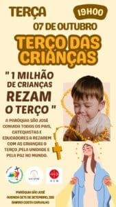 Nesta terça-feira, às 19h, acontecerá o Terço das Crianças, na Igreja Matriz, localizada na Avenida Sete de Setembro, 288. A iniciativa busca envolver as crianças, suas famílias, catequistas e educadores em um momento de oração pela unidade e pela paz no mundo.