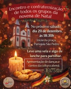 Haverá apresentação de danças e cantos da cultura alemã e lanche partilhado. O encontro busca fechar essa preparação em unidade, para isso a comunidade pede que os participantes levem uma vela e algo de comer para dividir.