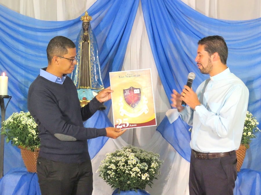 “Cada uma de nossas comunidades se encontram representadas também em nosso brasão comemorativo: através do escudo se encontra representada a Comunidade Santo Expedito que, como São Sebastião, também foi soldado; no M recordamos as três Comunidades dedicadas a Nossa Senhora Aparecida e uma dedicada a Santa Maria Eterna; na Palavra, temos a representação da Comunidade Santo Antônio, este que foi grande pregador do Evangelho; e na Cruz associamos a Comunidade Menino Jesus de Praga, cuja imagem traz em suas mãos o globo terrestre com a cruz sobre ele.