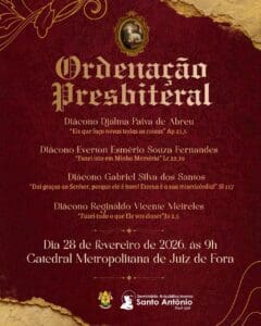 Na ocasião, o diácono receberá o ministério sacerdotal ao lado dos diáconos Djalma Paiva de Abreu, Gabriel Silva dos Santos e Reginaldo Vicente Meireles. A celebração será no próximo dia 28 de fevereiro, às 9h, na Catedral Metropolitana.