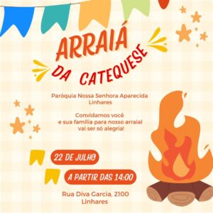 Na Paróquia Nossa Senhora Aparecida, do Linhares, o “Arraiá da Catequese” será neste sábado (22), a partir das 14h. O evento, aberto ao público, oferecerá quadrilha e barraquinhas de pescaria, doces e salgados. As atividades acontecerão na Igreja Matriz, que fica na Rua Diva Garcia, 2100.