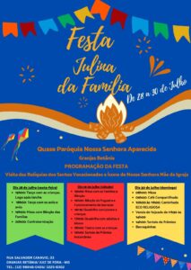 Já na Quase-Paróquia Nossa Senhora Aparecida, do Granjas Betânia, a “Festa Julina da Família” será no próximo final de semana, de 28 a 30 de julho. O evento marcará a visita das relíquias de santos vocacionados e do Ícone de Maria, Mãe da Igreja à comunidade. A programação começa na sexta-feira (28), às 15h, e inclui oração do terço, missas, bênção da fogueira, quadrilha, teatro e sorteios de prêmios. O endereço é Rua Salvador Cannavio, 06 – Granjas Betânia.