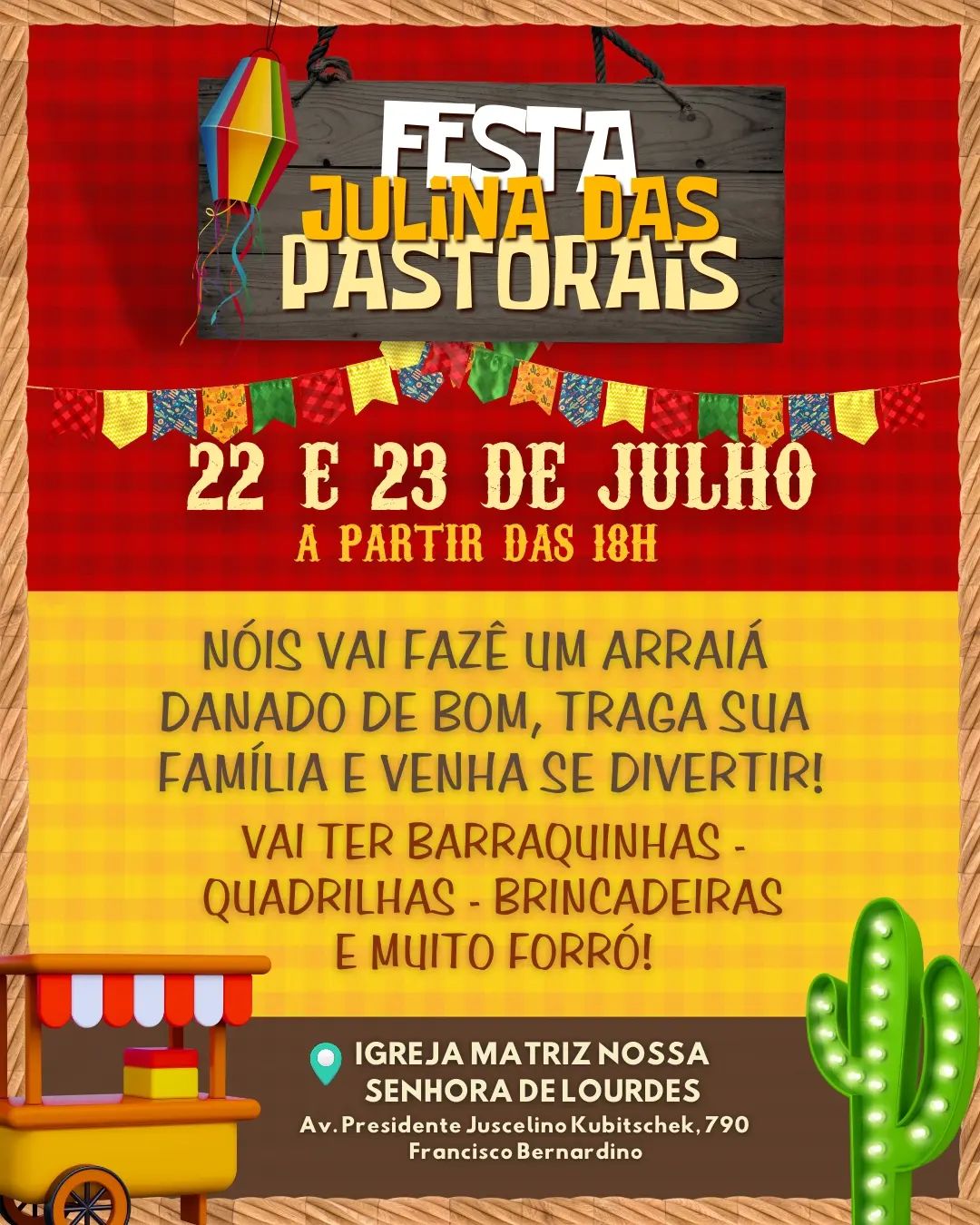 Neste final de semana, a Matriz Nossa Senhora de Lourdes, localizada no Bairro Francisco Bernardino, sedia a tradicional “Festa Julina das Pastorais”. Nos dias 22 e 23 de julho, a partir das 18h, quem comparecer ao local poderá se divertir com quadrilha, forró e brincadeiras, e se deliciar com comidas típicas. O templo fica na Av. Presidente Juscelino Kubitschek, 790.