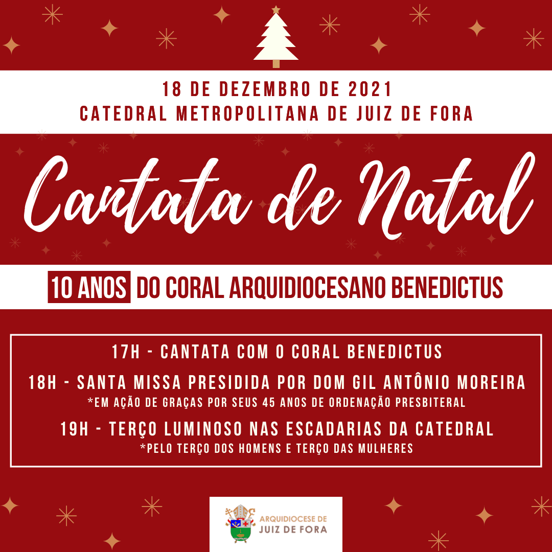 Na Catedral Metropolitana, a Cantata de Natal será no próximo sábado, 18 de dezembro, às 17h. O Coral Arquidiocesano Benedictus, que na ocasião comemorará dez anos de existência, será o protagonista do evento. Após a apresentação, Dom Gil Antônio Moreira, fundador do coral, preside Missa em ação de graças por este feito e também por seus 45 anos de Ordenação Presbiteral. A noite será encerrada às 19h, com Terço luminoso nas escadarias da Catedral.