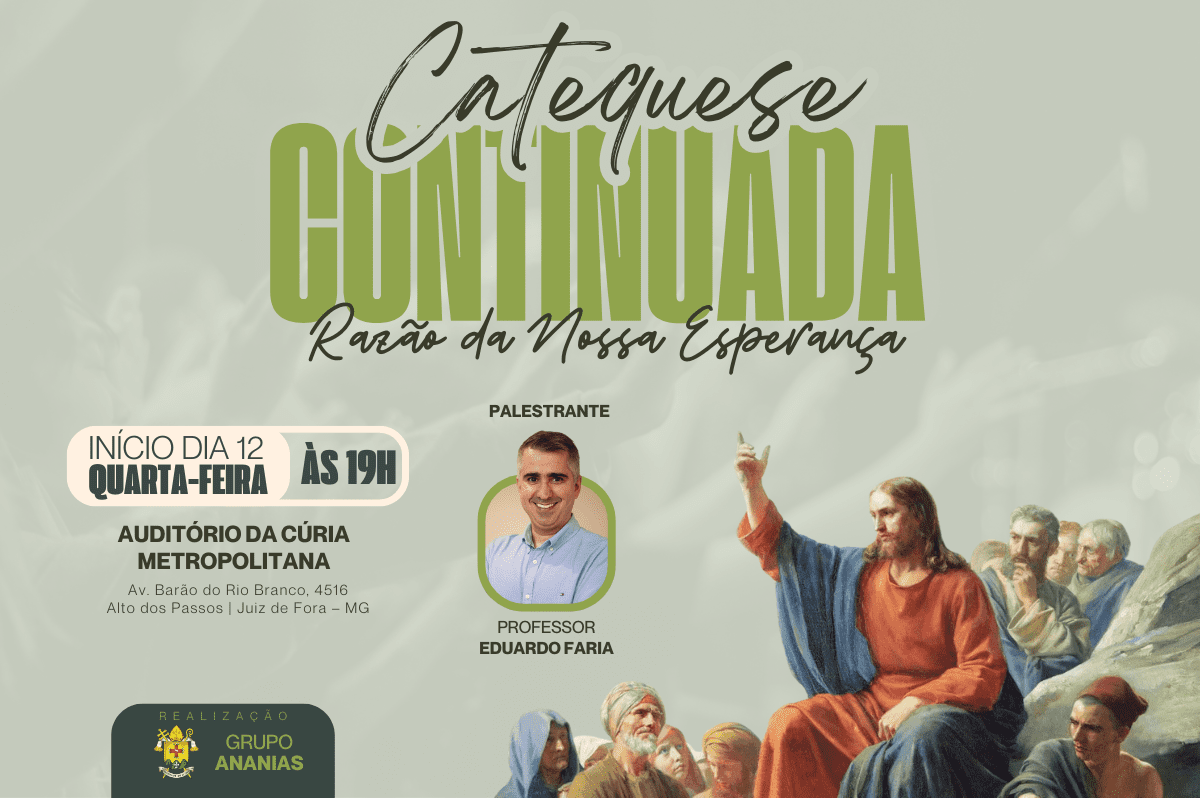 Na próxima semana, tem início o projeto de catequese continuada do Grupo Ananias, intitulado “Razão da Nossa Esperança”. A iniciativa consiste em uma série de encontros mensais, realizados na Cúria Metropolitana, sempre na primeira quarta-feira do mês, às 19h. Excepcionalmente, o primeiro encontro acontecerá no dia 12 de março.