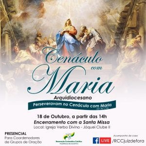 A Renovação Carismática Católica (RCC) da Arquidiocese de Juiz de Fora promove, no dia 18 de outubro, o Cenáculo com Maria 2020, com o tema “Perseveravam no Cenáculo com Maria” (At 1, 14). O evento é o primeiro a ser realizado pelo movimento após o início da pandemia do Coronavírus e terá todos os cuidados de higiene e proteção necessários. Somente será permitida a presença de coordenadores dos Grupos de Oração previamente inscritos. Todo o público restante poderá acompanhar gratuitamente, ao vivo, pelas redes sociais do movimento.