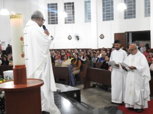 Ao final da Eucaristia, o novo pároco dirigiu uma palavra aos presentes. “Uma palavra [que resume] é gratidão. Agradecer a paróquia Divino Espírito Santo, que me acolheu neste último seis anos, anos difíceis que passamos, a pandemia, em meio a dois acidentes que fui acometido, mas em meio a muitas coisas bonitas que ficaram por lá. Eu saio das asas do Espírito Santo e venho para o colo de Nossa Senhora. Para mim é uma alegria muito grande retornar a Zona Norte. Que Deus possa ser manifestado com ação na vida de todas as nossas comunidades, que agora quero estar do lado na caminhada”.