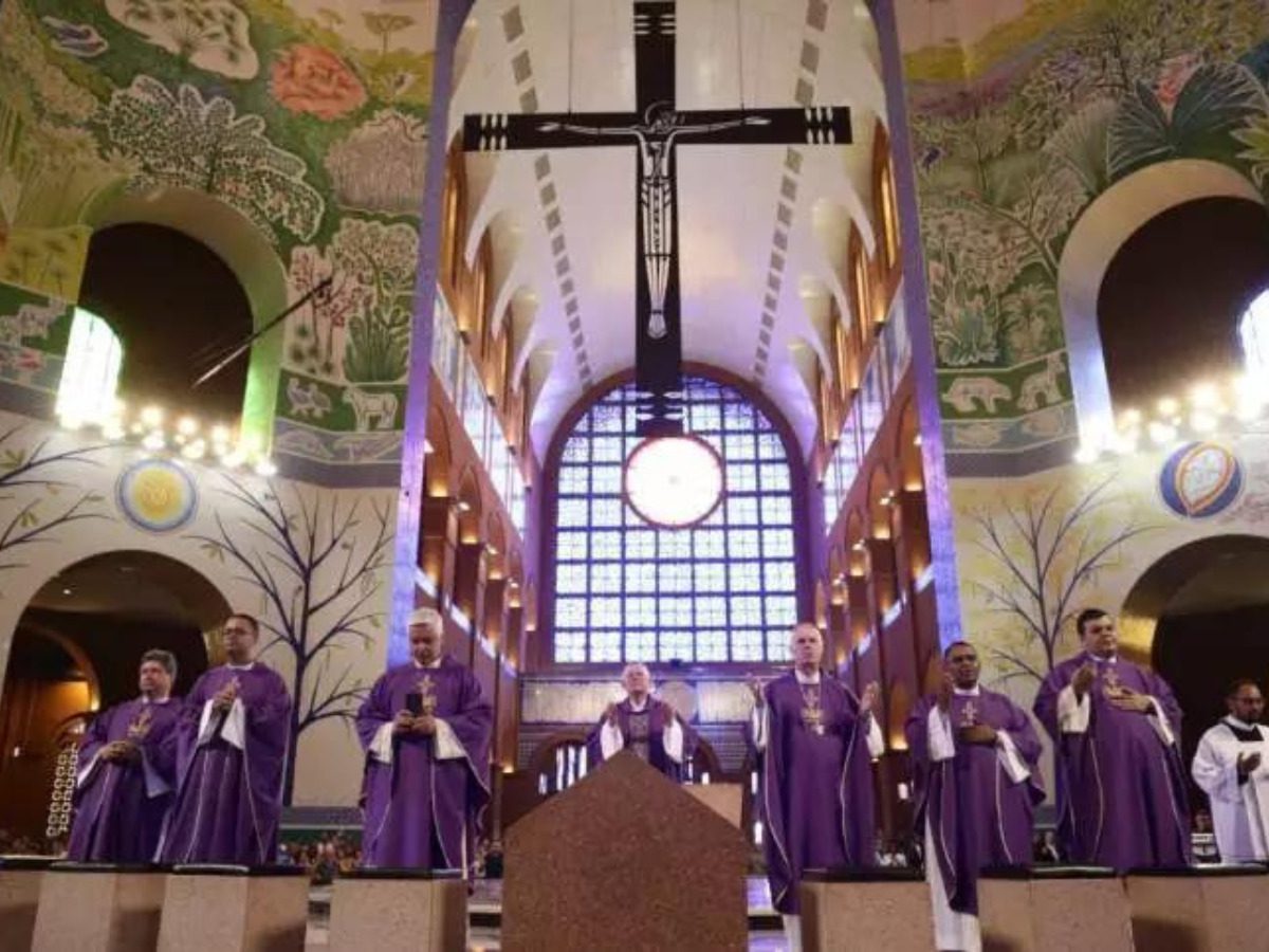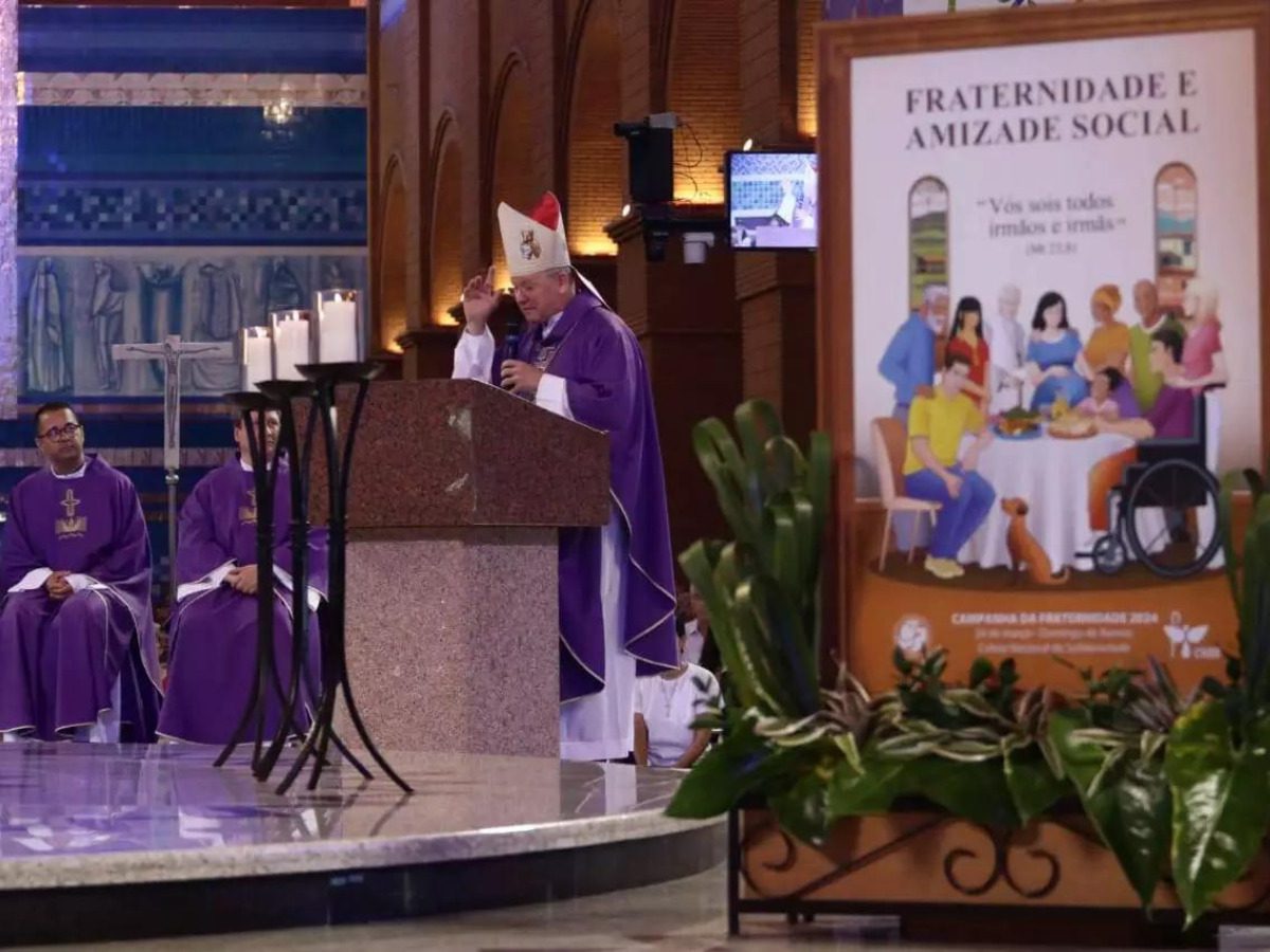 Nesse domingo (18), na Santa Missa das 8h, no Altar Central do Santuário Nacional de Aparecida (SP), a Conferência Nacional dos Bispos do Brasil (CNBB) realizou a abertura da Campanha da Fraternidade 2024, que neste ano apresenta o tema “Fraternidade e amizade social” e o lema “Vós sois todos irmãos e irmãs” (Mt 23,8). A celebração foi presidida pelo presidente da CNBB, Dom Jaime Spengler, Arcebispo Metropolitano de Porto Alegre (RS), concelebrada pelo Arcebispo de Aparecida, Dom Orlando Brandes, pelo Missionário Redentorista e Reitor do Santuário Nacional, Pe. Eduardo Catalfo, e os demais sacerdotes presentes.